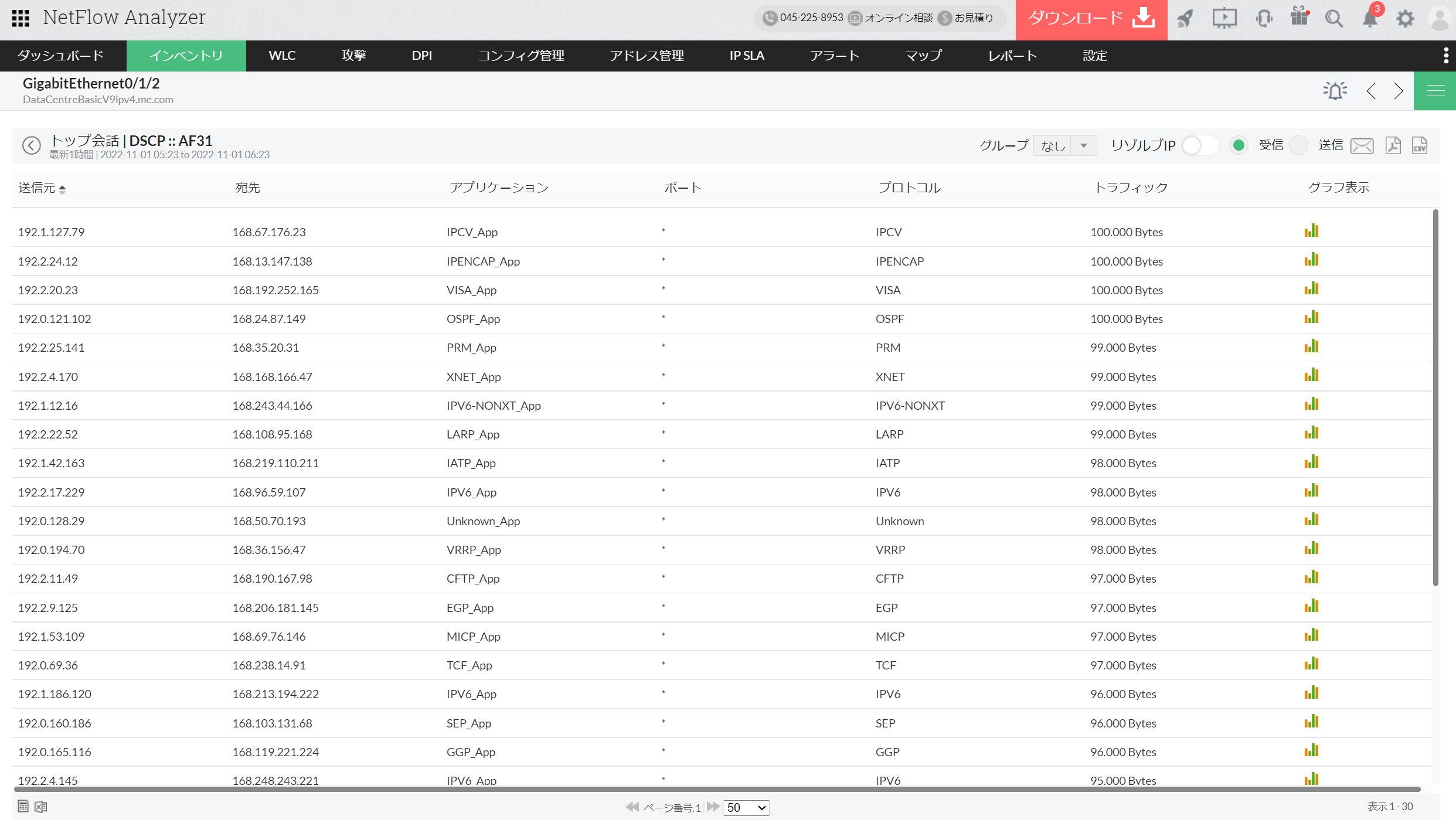 [アプリケーションを表示]を有効化することで、各DSCP値のアプリケーション配分を確認できます。