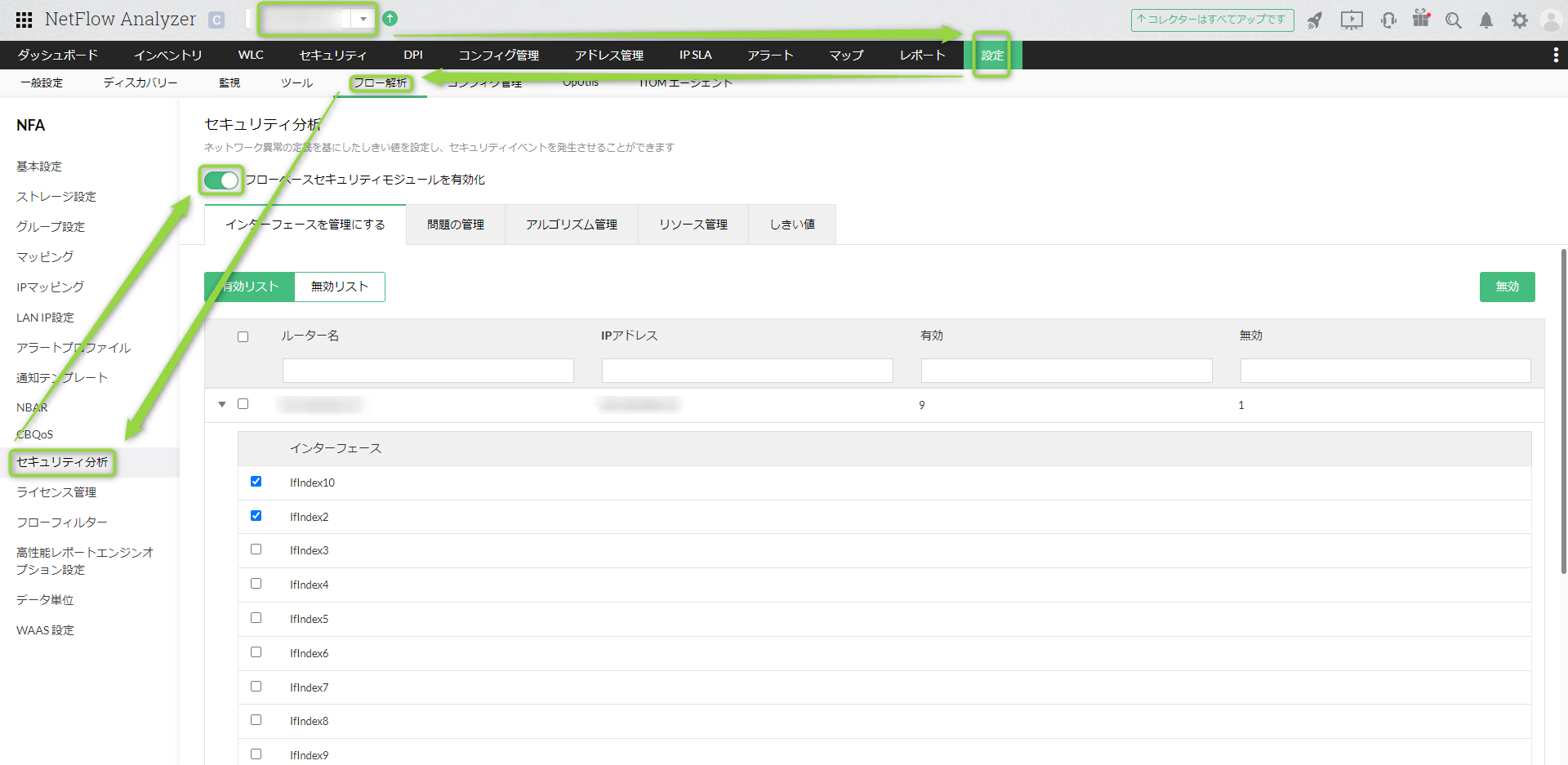 特定のコレクターを選択→[設定]→[フロー分析]→[セキュリティ分析]