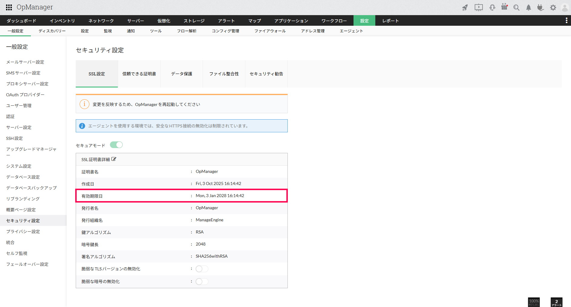 有効期限日など、内容に問題ないことを確認してください。自己署名証明書の期限は、生成してから27ヶ月(2年3ヶ月)です。 - 変更を反映するため、NetFlow Analyzerを再起動します。