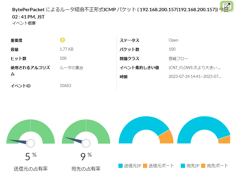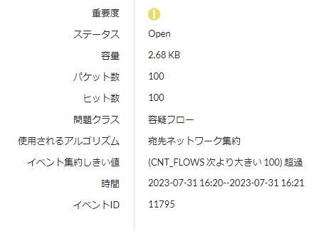 | 疑わしいフロー | 監視パケット内の送信元/宛先IP以外(ポートやプロトコルなど)が疑わしい |