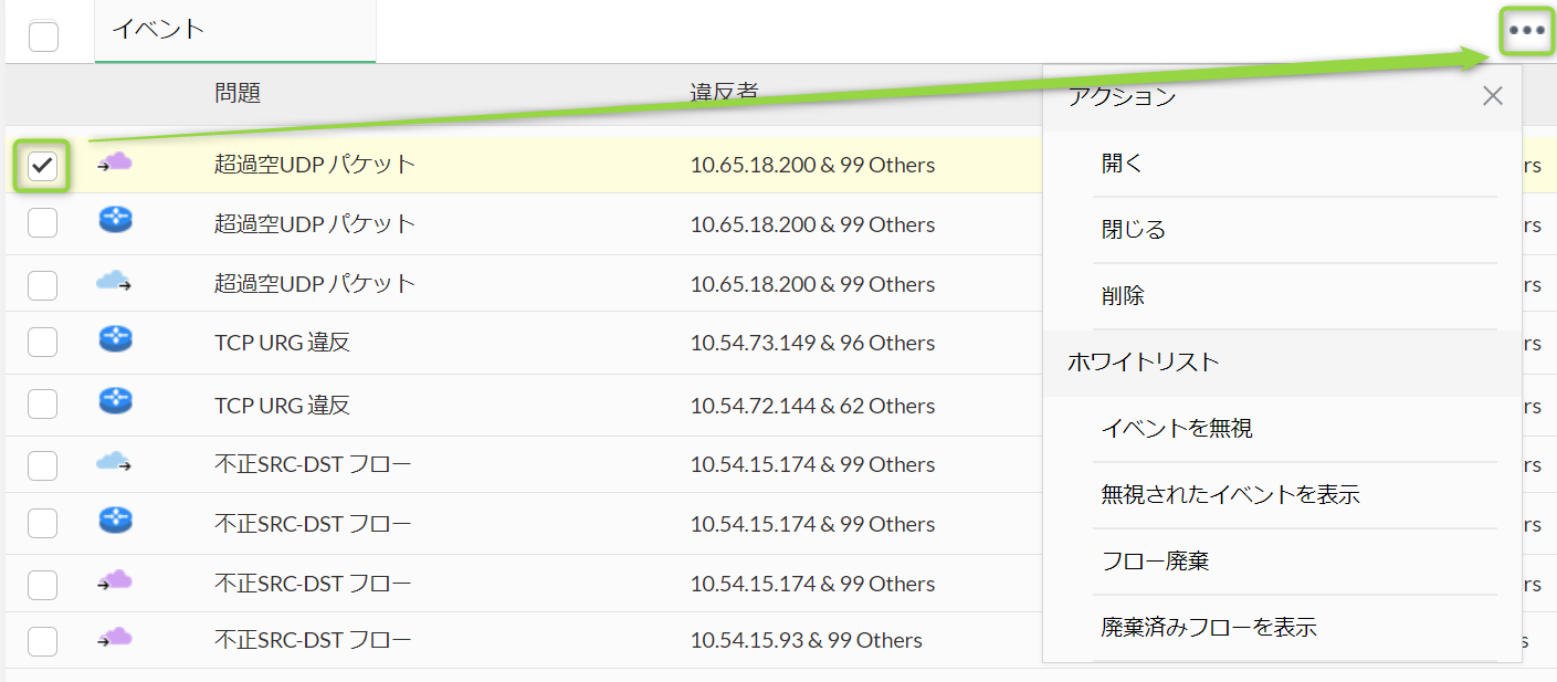 任意イベントのチェックボックスをクリック > 三点(…)アイコン > [アクション]項目からステータス(オープン(開く)、クローズ(閉じる)、削除)移行、[ホワイトリスト]項目から該当イベントのホワイトリスト関連の操作が可能です。