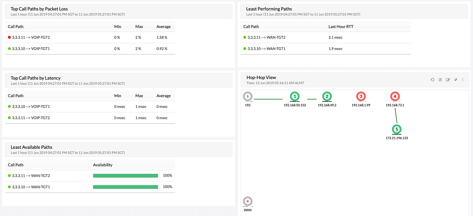 これらのビューにはロケーション、宛先とあわせて、ジッター、遅延、パケット ロスの詳細が表示されます。不良コールの詳細と、ジッター、遅延、MOS、パケット ロスを基準にしたトップ10コール パスも表示されます。VoIPリンクのパフォーマンスを一目で確認でき、問題が予兆のうちにユーザーに影響が及ばぬよう初動が可能です。
